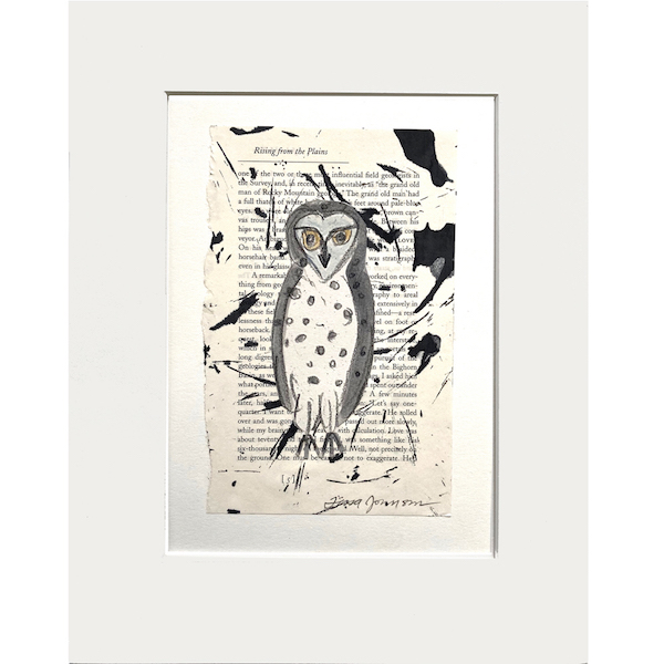 | Owls collaged on pages from Rising from the Plains. Each piece is done with ink on book pagesm watercolor and graphite then collaged together on acid free board. 11 x 14 framed, image size 7 x 9 image size. |