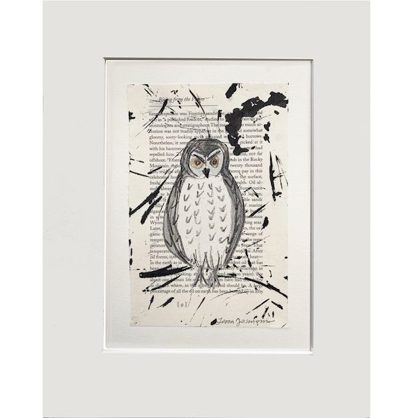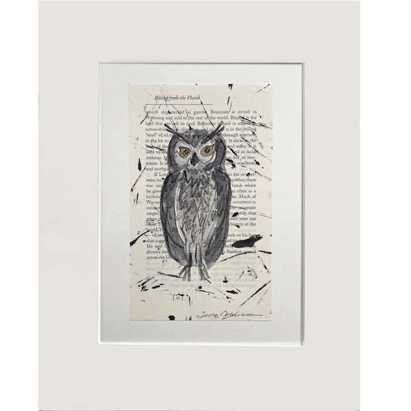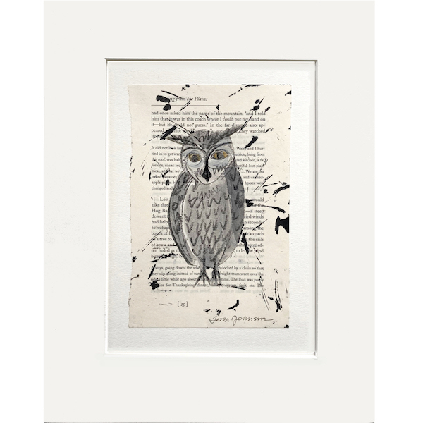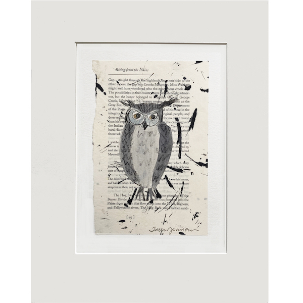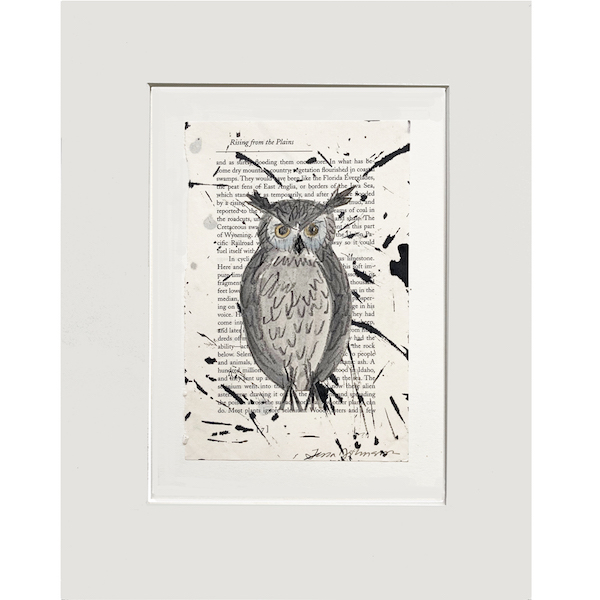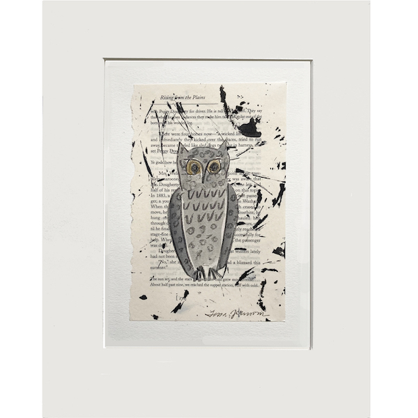 | Owls collaged on pages from Rising from the Plains. Each piece is done with ink on book pagesm watercolor and graphite then collaged together on acid free board. 11 x 14 framed, image size 7 x 9 image size. |